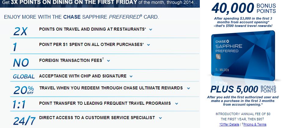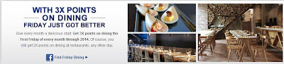 Chase Sapphire和Chase Sapphire Preferred卡友在2014年每個月第一個星期五的餐廳消費都可以拿到3X點數,除了基本的$1消費拿2點,再額外給1點,雖然沒有很多,但是多拿一點算一點囉,而且又是很好用的UR點數!