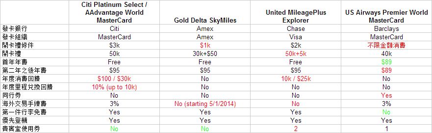 (註:1. 僅列出各家航空公司聯名卡的入門版本 2. 僅比較美國四大國際航空公司,廉價和其他地域型航空不在比較範圍內 3. 表格內容是精簡過的,詳細說明及條款請參考官方網站 4. 各種開卡禮、福利和條款均有隨時變動的可能,辦卡前也請務必參考官方網站)